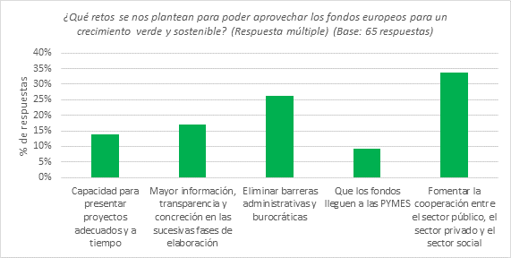Nuevas medidas propuestas por el sector empresarial fueron también una mayor inversión en adaptación, financiar la transición justa, ahondar en la colaboración público-privada y avanzar en la clarificación de conceptos de cara al consumidor. Asimismo, los retos más importantes identificados para aprovechar con eficiencia los fondos europeos Next Generation se dirigen a fomentar la colaboración entre agentes públicos, privados y sector social y a eliminar trabas administrativas y burocráticas.