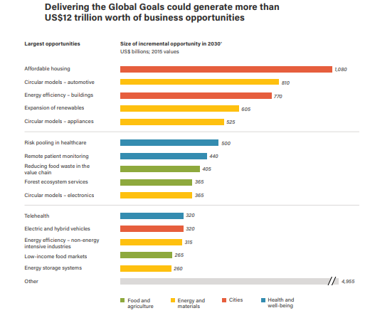Informes publicados cifran las oportunidades asociadas con los ODS en 12 billones anuales de alternativas de negocio hasta 2030, capaces de crear 380 millones de puestos de trabajo. Se trata de nuevas soluciones para la salud, la movilidad, la educación, la energía, la edificación, entre otras áreas. Pero el mundo empresarial tiene que aproximarse a los ODS para hacerlos suyos: bajar de los 17 ODS a las 169 metas puede ayudar a las empresas a concretar su contribución.